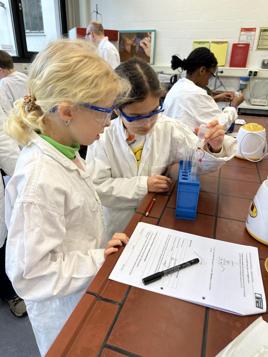 Im Labor führten die Kinder drei unterschiedliche Experimente durch. Mit der Fettfleckprobe untersuchten sie, welche Lebensmittel Fett enthalten. Ein durchscheinender Fleck auf Filterpapier zeigte dabei deutlich an, wenn Fett vorhanden war. Anschließend erforschten die Kinder, welche Nahrungsmittel Stärke enthalten. Dafür nutzten sie Iodlösung, die Stärke sofort dunkelblau verfärbt – ein eindrucksvoller Effekt, der für viele Aha-Momente sorgte. Zum Abschluss beschäftigten sich die Kinder mit dem Eiweißnachweis. Sie beobachteten, wie sich eine Eiweißlösung durch Hitze oder Essig sichtbar verändert. Dieser Vorgang wird „Denaturierung“ genannt und spielt auch im Alltag eine wichtige Rolle, zum Beispiel beim Kochen eines Eis oder beim Erhitzen von Milch.
