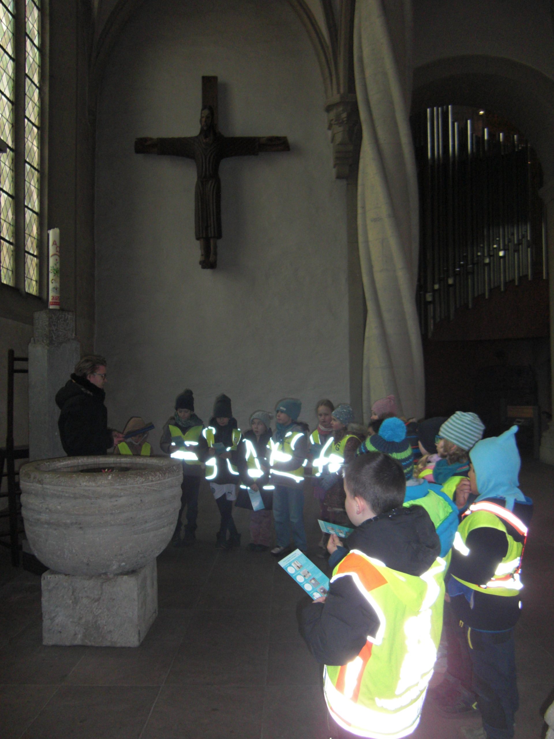 Zuerst haben wir am Taufbecken in der Magnikirche die Geschichte von Jona und dem Walfisch gehört. Danach haben wir im Dom die Osterkerze kennengelernt. Anschließend haben wir in der Aegidienkirche den Taufstein mit den Fischen und Krebsen angeschaut. Zum Abschluss durfte jeder von uns eine Kerze anzünden.